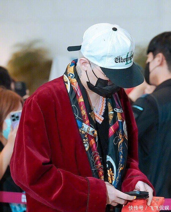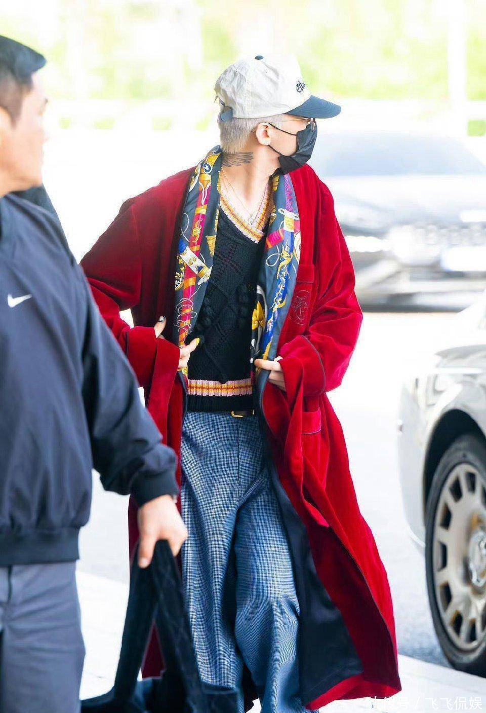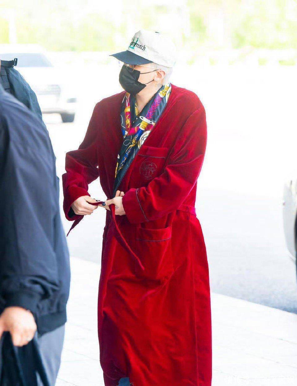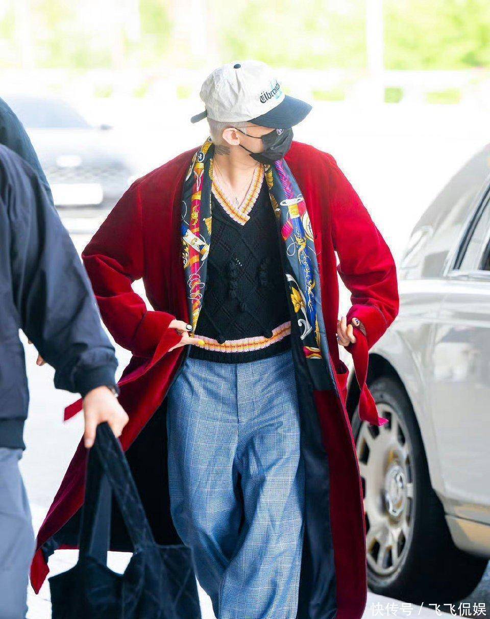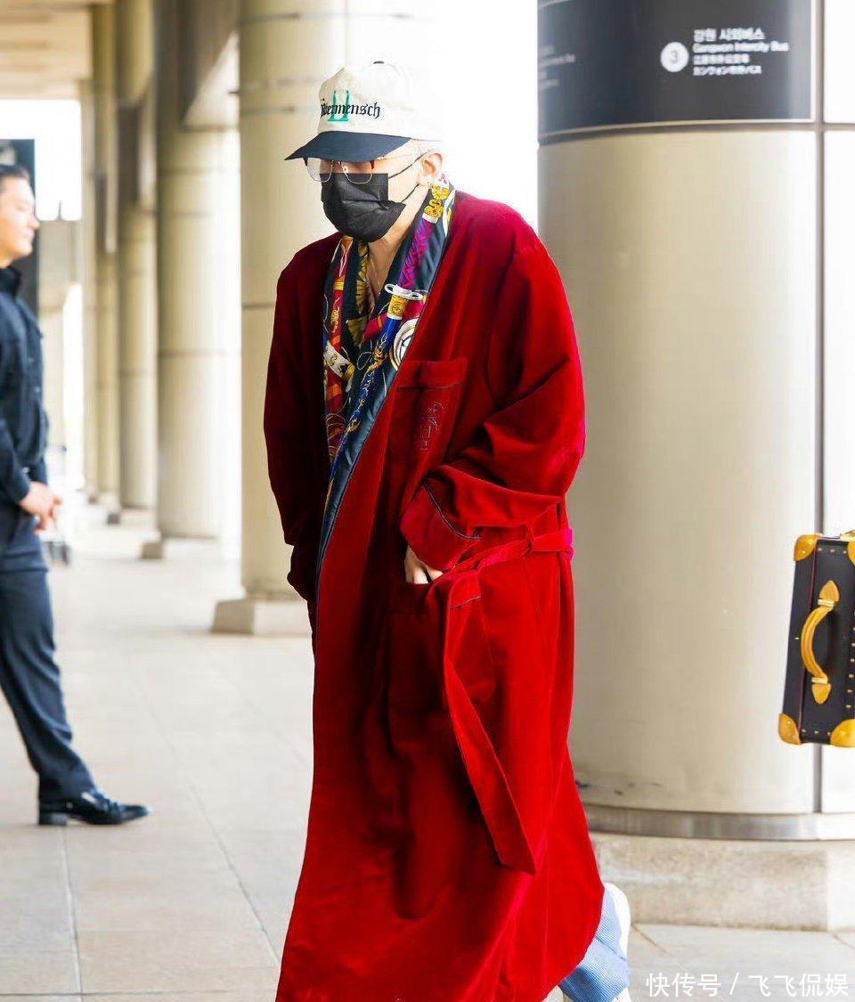 穿着睡袍就出门了,还穿得那么自在不拘束,这睡袍看着都不像睡袍了,倒更像件大衣。而且权志龙这件睡袍太惹眼了,中国红的颜色配上丝绒的料子,面料一反光,红色就更亮眼、更抓人了。